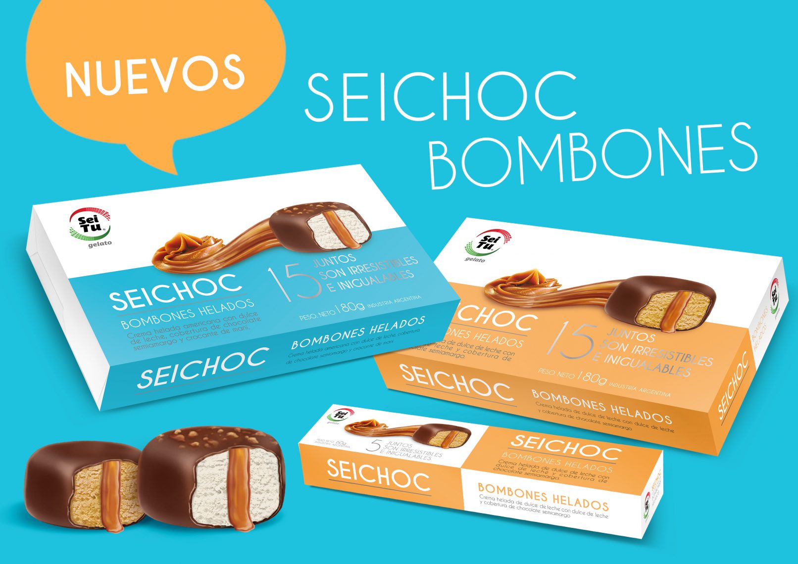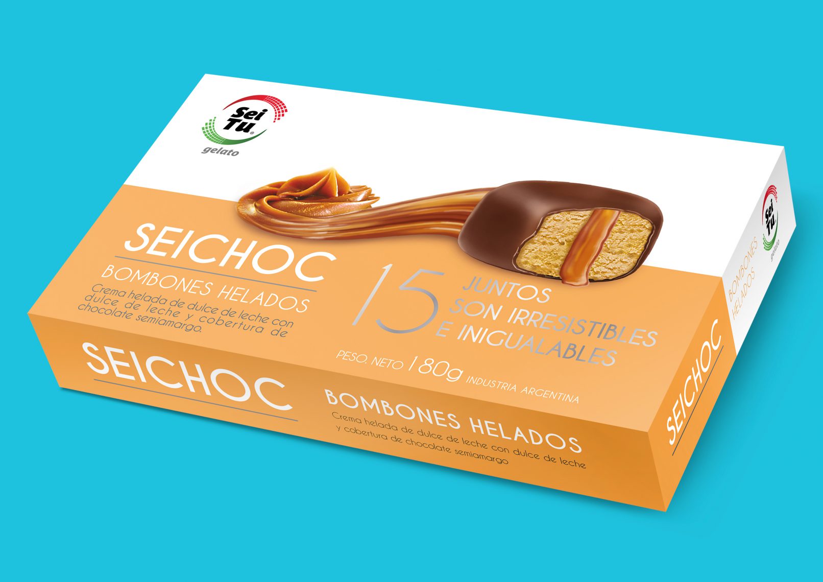 Desarrollamos el packaging para estos bombones de edición limitada. Nos inspiramos en el formato de las cajas de bombones tradicionales pero le aportamos el plus del color y el contraste del celeste y el naranja. Un producto fácilmente reconocible dentro de la amplia gama de helados Seitu.