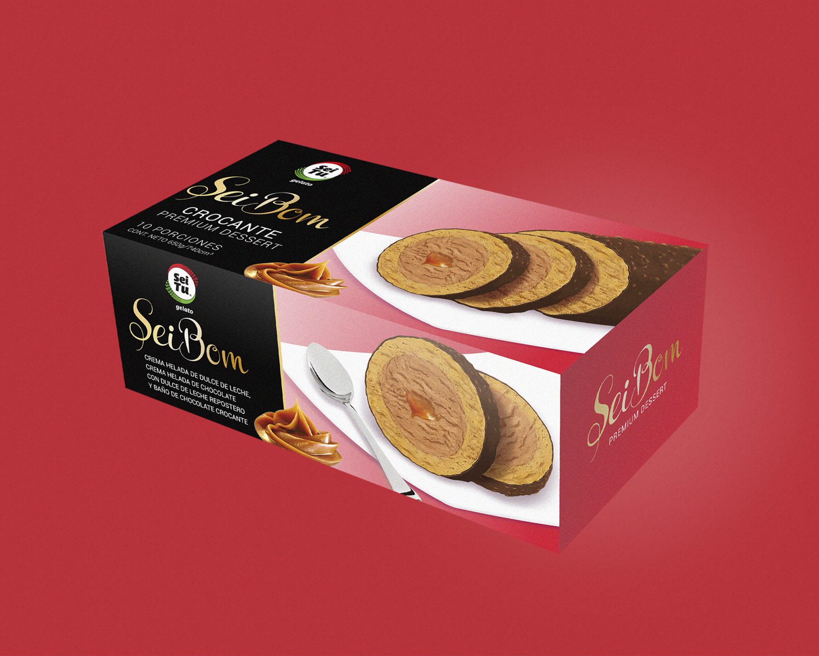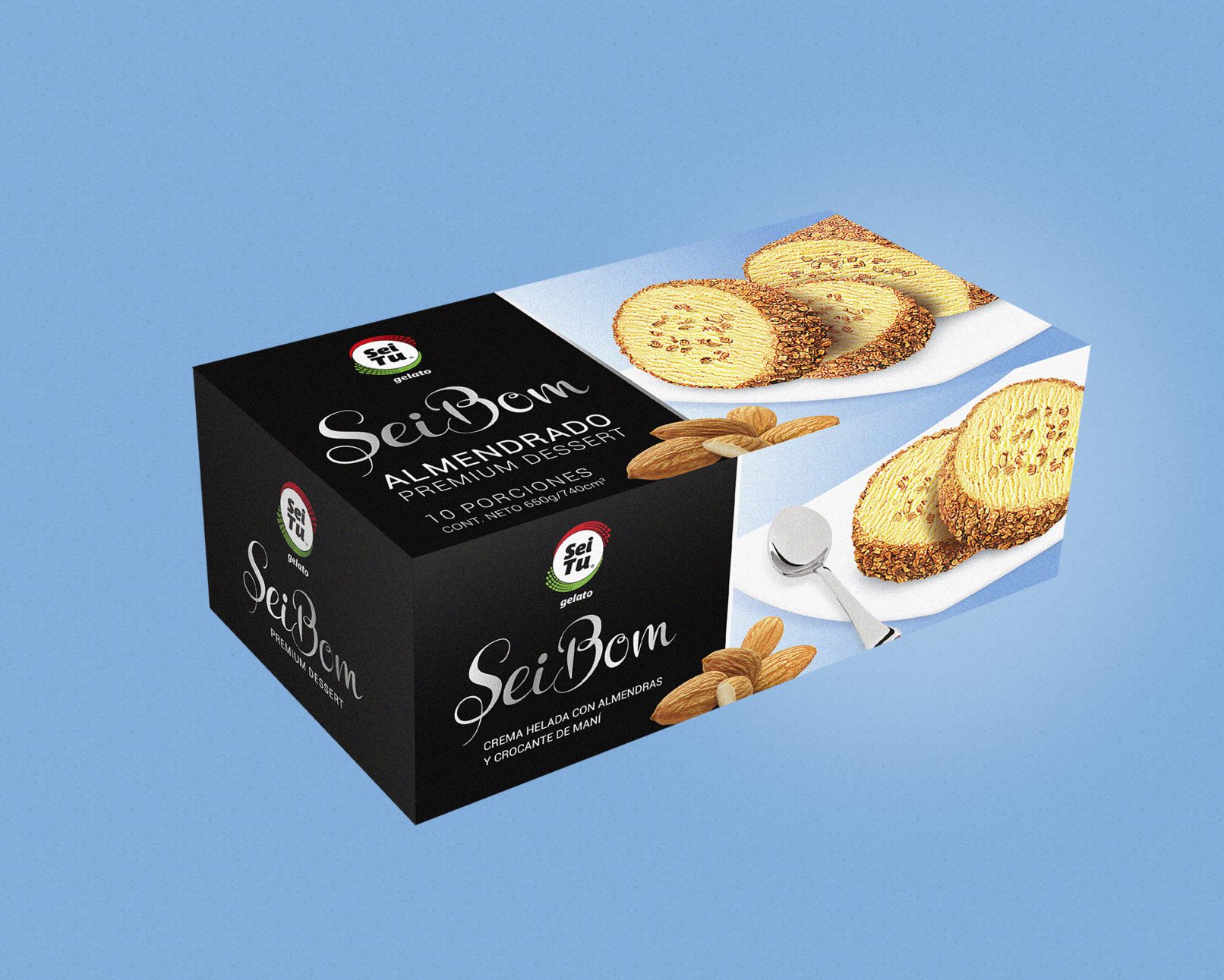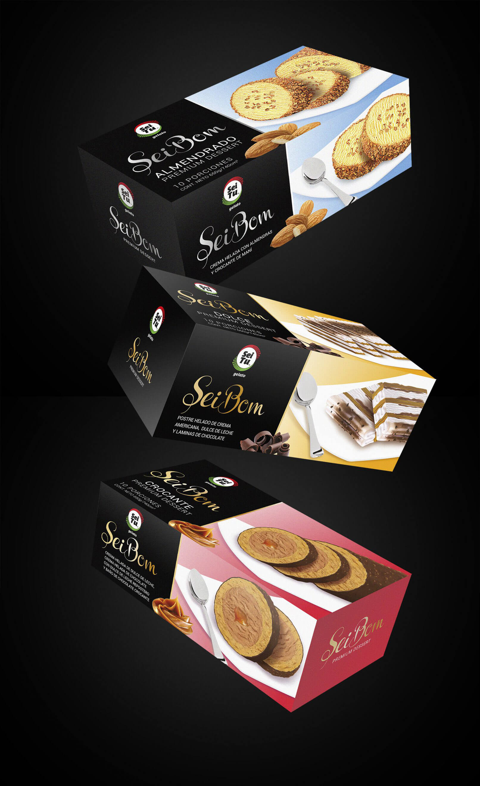 Como resultado del trabajo paulatino en la renovación de la imagen de Seitu, nace Seibom. Una linea de postres helados que fue rediseñada para convertirse en su entrega más premium, acompañando la línea Gelato, las cremas premium también diseñadas por el estudio.