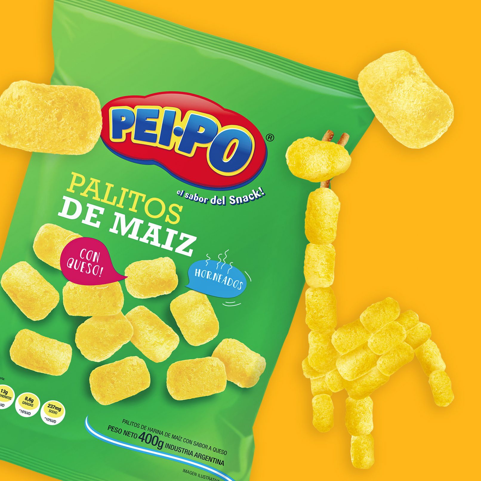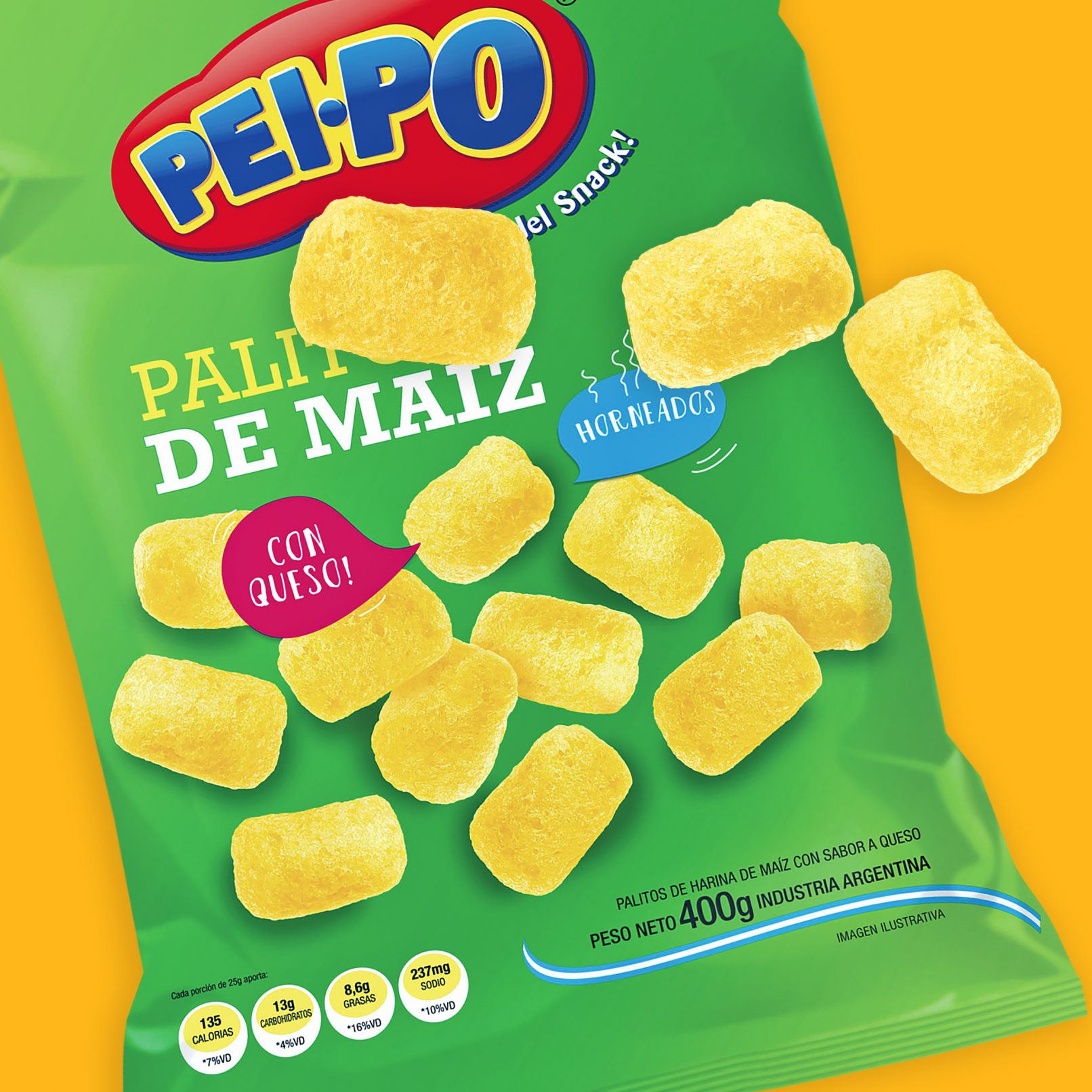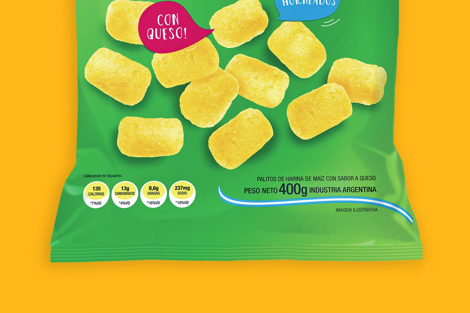 Aunque en los frentes se continúe con la línea de snacks Papas fritas clásicas y americanas, en los dorsos se buscó adaptar los productos Palitos de maíz y Bolitas crocantes a un consumidor del target infantil.